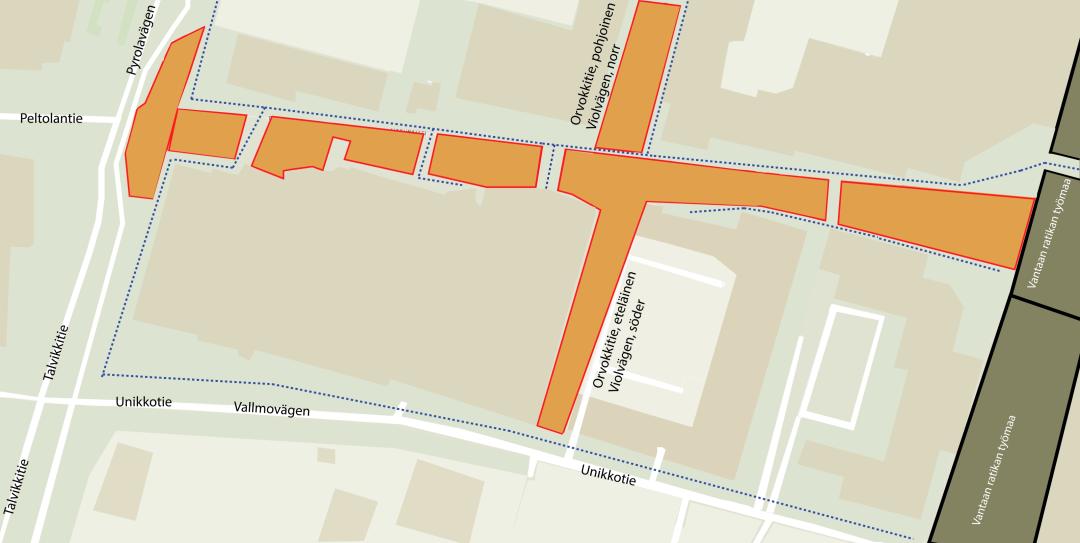 • Tikkuraitin etelänpuoleinen osa Orvokkitiestä on suljettu kaikelta liikenteeltä. Jalankulkijoiden ja pyöräilijöiden kiertoreitit kulkevat Talvikkitien kautta.