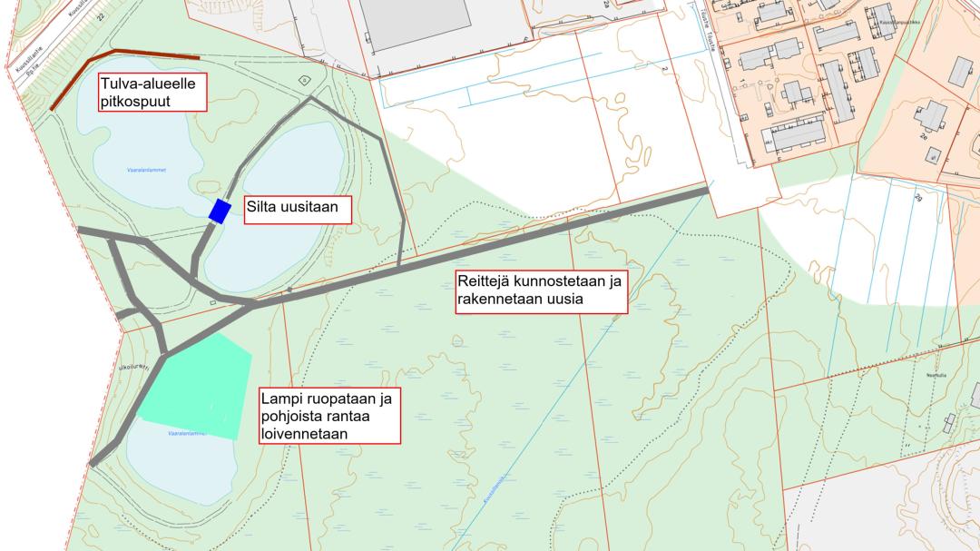 - Kun alueelle haettu vesilupa on saatu, Vaaralanlampi ruopataan. Samalla lammen pohjoista rantaa loivennetaan ja siihen tuodaan puhdasta hiekkaa.