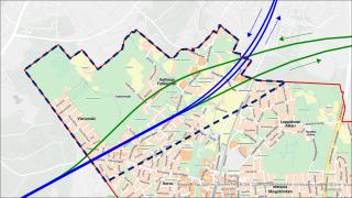 Itäradan (vihreällä) ja Lentoradan (sinisellä) ratatunnelit suunnittelualueella.