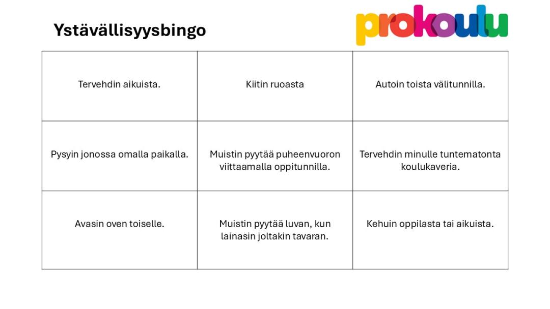 Joulun aika on erityisesti ystävällisyyden aikaa. ProKoulussa on marras-joulukuun ajan keskitytty ystävällisyyden teemoihin. Esimerkiksi luokissa on ollut tai on vielä tulossa kaveripassin parissa työskenteleminen tai ystävällisyyden haastebingon suorittaminen. Kotonakin voi huomioida kiitoksin lapsen tai nuoren pieniäkin ystävällisiä tekoja.