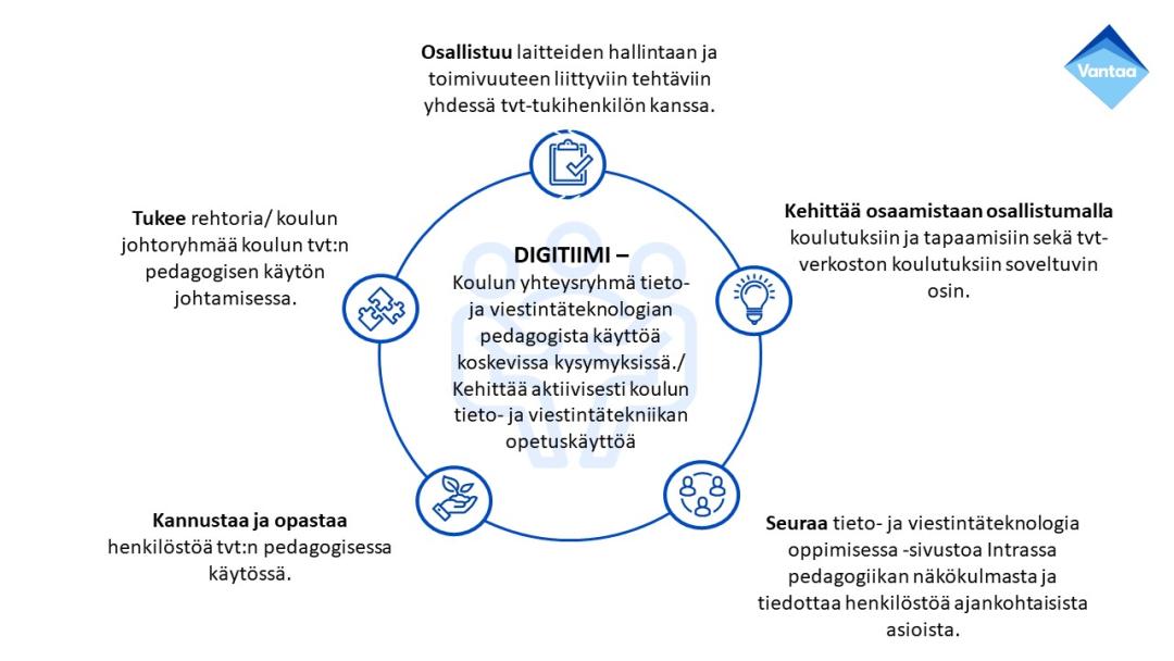 Kouluissa toimii digitiimi, johin kuuluu myös koulun tvt-yhdysopettaja. Digitiimin tehtävät on kuvattu oheisessa kuvassa.