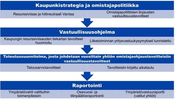 Vantaan kaupunki omistajana edellyttää, että tytäryhtiöt toimivat vastuullisesti. Tytäryhtiöiden tulee tunnistaa oman toimintansa aiheuttamat ympäristövaikutukset sekä toimia taloudellisesti ja sosiaalisesti vastuullisella tavalla. Yhteisökohtaisissa omistajapoliittisissa linjauksissa kullekin yhtiölle on asetettu erityinen vastuullisuuteen liittyvä teema tai tavoite. Suurimmat tytäryhtiöt ovat laatineet omat vastuullisuusohjelmat, jossa ovat tunnistaneet liiketoimintansa kannalta keskeiset vastuullisuuden osa-alueet.