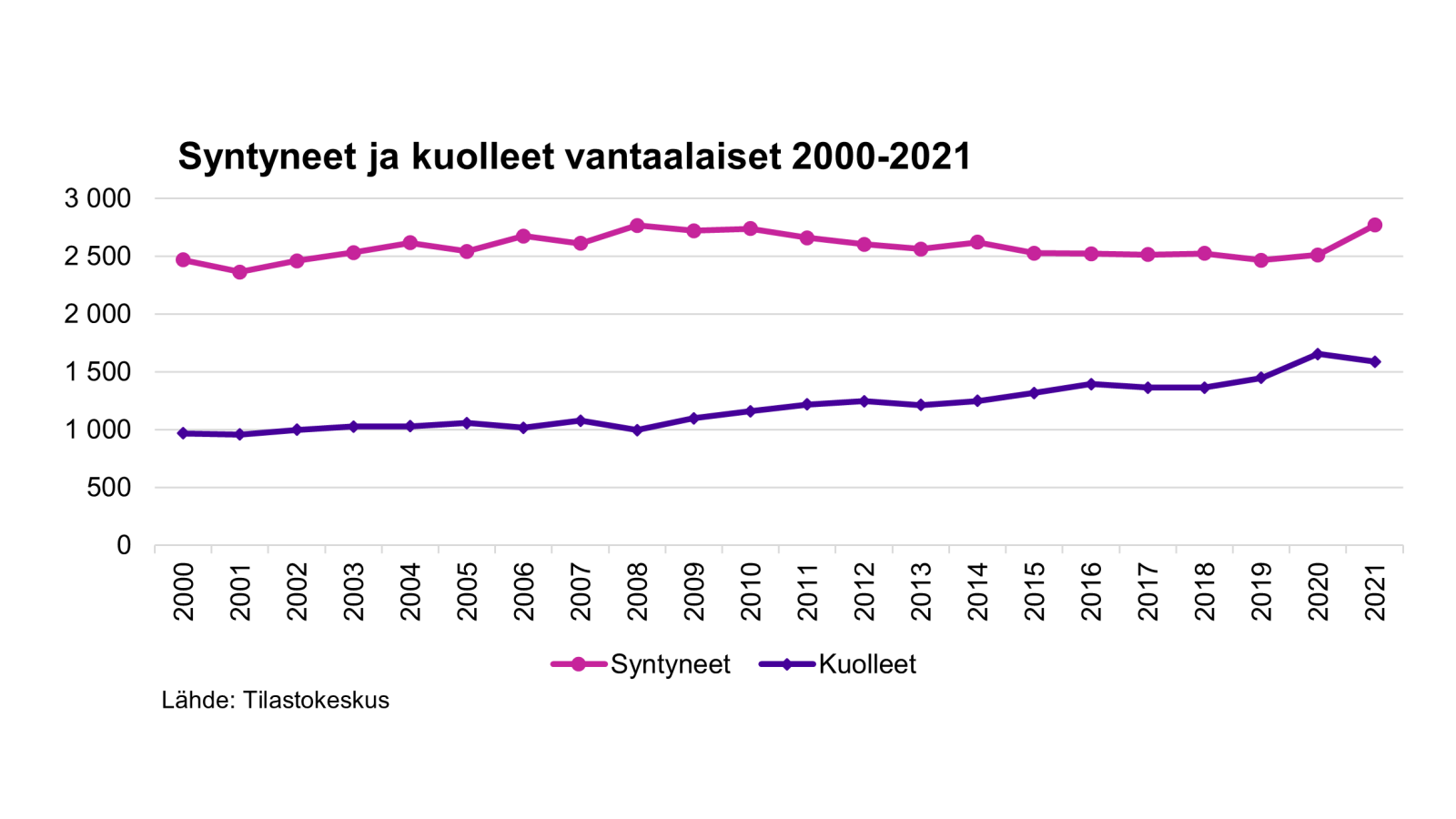 Vuonna 2021 Vantaalla syntyi 2 768 vauvaa, joka oli enemmän kuin koskaan aiemmin. Muutos aiempiin vuosiin on suuri, koska edelliset kuusi vuotta vauvojen määrä on ollut alhaisella tasolla ja vuonna 2021 syntyneitä oli 250 enemmän kuin vuonna 2020. Edellisen kerran syntyneiden määrässä oltiin yhtä korkealla tasolla vuonna 2008, jolloin vauvoja syntyi vain muutama vähemmän, 2 766.