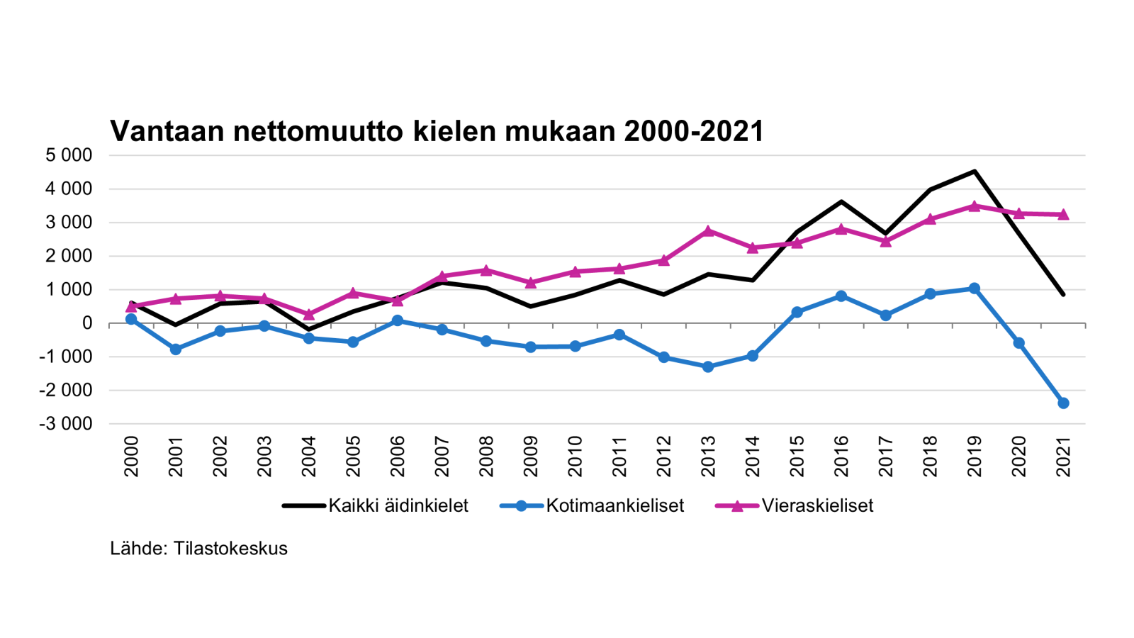 Vuosina 2015–2019 Vantaa sai muuttovoittoa sekä kotimaankielisistä että vieraskielisistä. Vieraskielisten osuus muuttovoitosta oli kuitenkin noina vuosina huomattava, keskimäärin 80 prosenttia vuosittain. Vuonna 2020 kotimaankielisten nettomuutto kääntyi tappiolliseksi ja vuonna 2021 muuttotappio syveni entisestään. Vuonna 2021 suomenkielisten nettomuutto jäi negatiiviseksi 2 350 hengen verran, joka oli 1 700 henkilöä enemmän kuin vuonna 2020. Ruotsinkielisten osalta muuttoliike jäi 28 hengen verran miinukselle vuonna 2021.