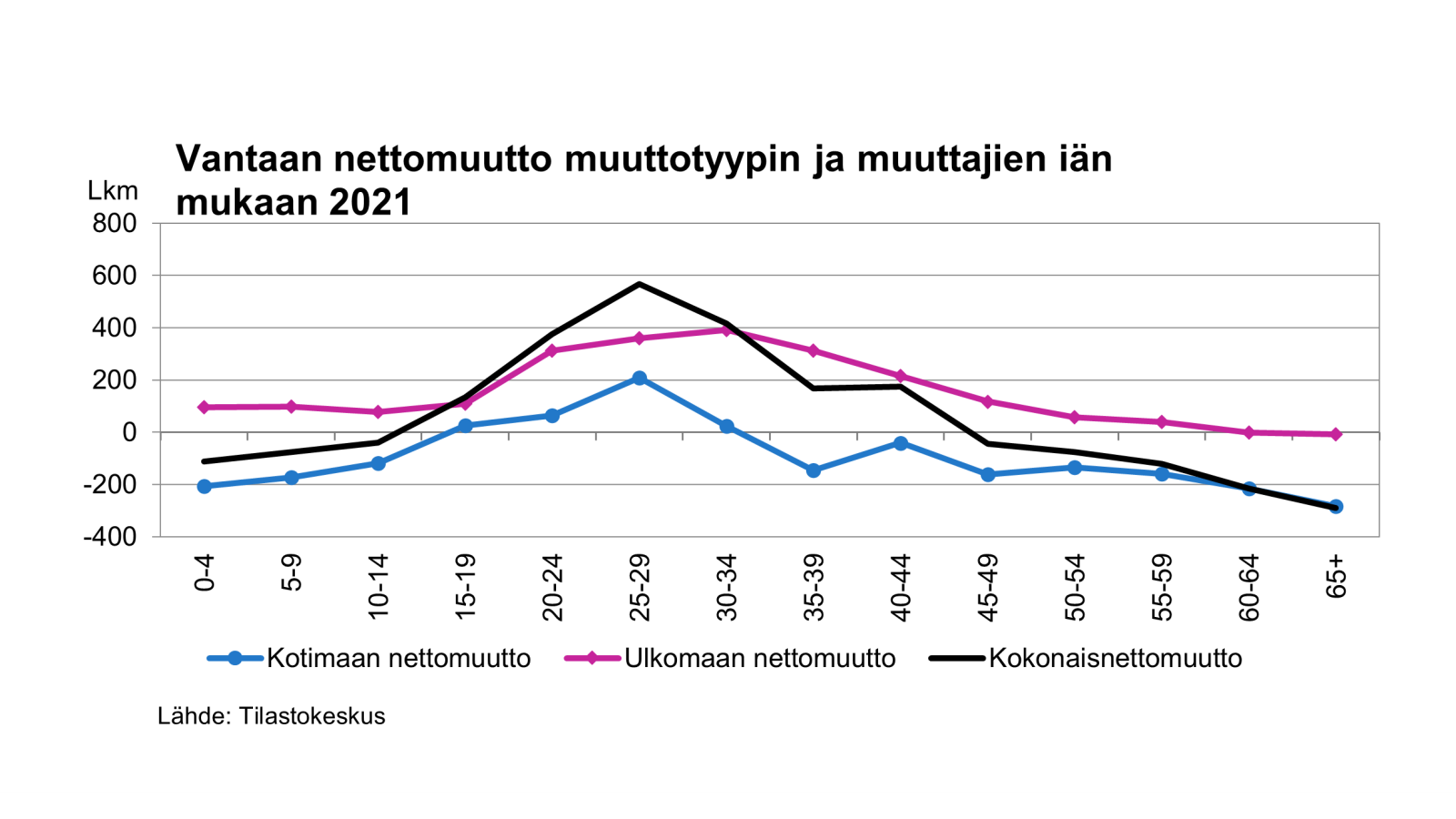 Koronasta huolimatta Vantaalle muutti edelleen nuoria aikuisia vuonna 2021. Vantaa sai 20–34-vuotiaista muuttovoittoa vajaat 1 400 henkilöä, minkä ansiosta nettomuutto pysyi positiivisena. Nettomuuton ikäjakauma oli varsin erilainen kotimaan ja ulkomaan muuttoliikkeessä. Ulkomaan nettomuutossa Vantaa koki niukat muuttotappiot ainoastaan vanhemmissa, 60 vuotta täyttäneiden, ikäryhmissä. Kotimaan nettomuutto jäi puolestaan positiiviseksi ainoastaan 15–34-vuotiaissa ja heidänkin osaltaan muuttovoitossa näkyy suurempi piikki vain 25–29-vuotiaissa.