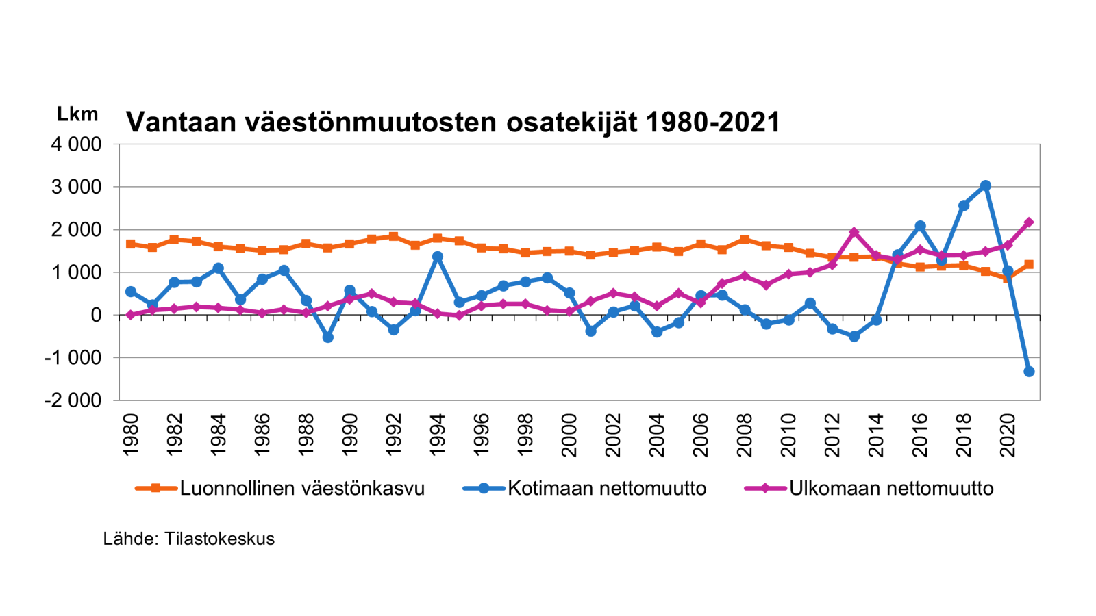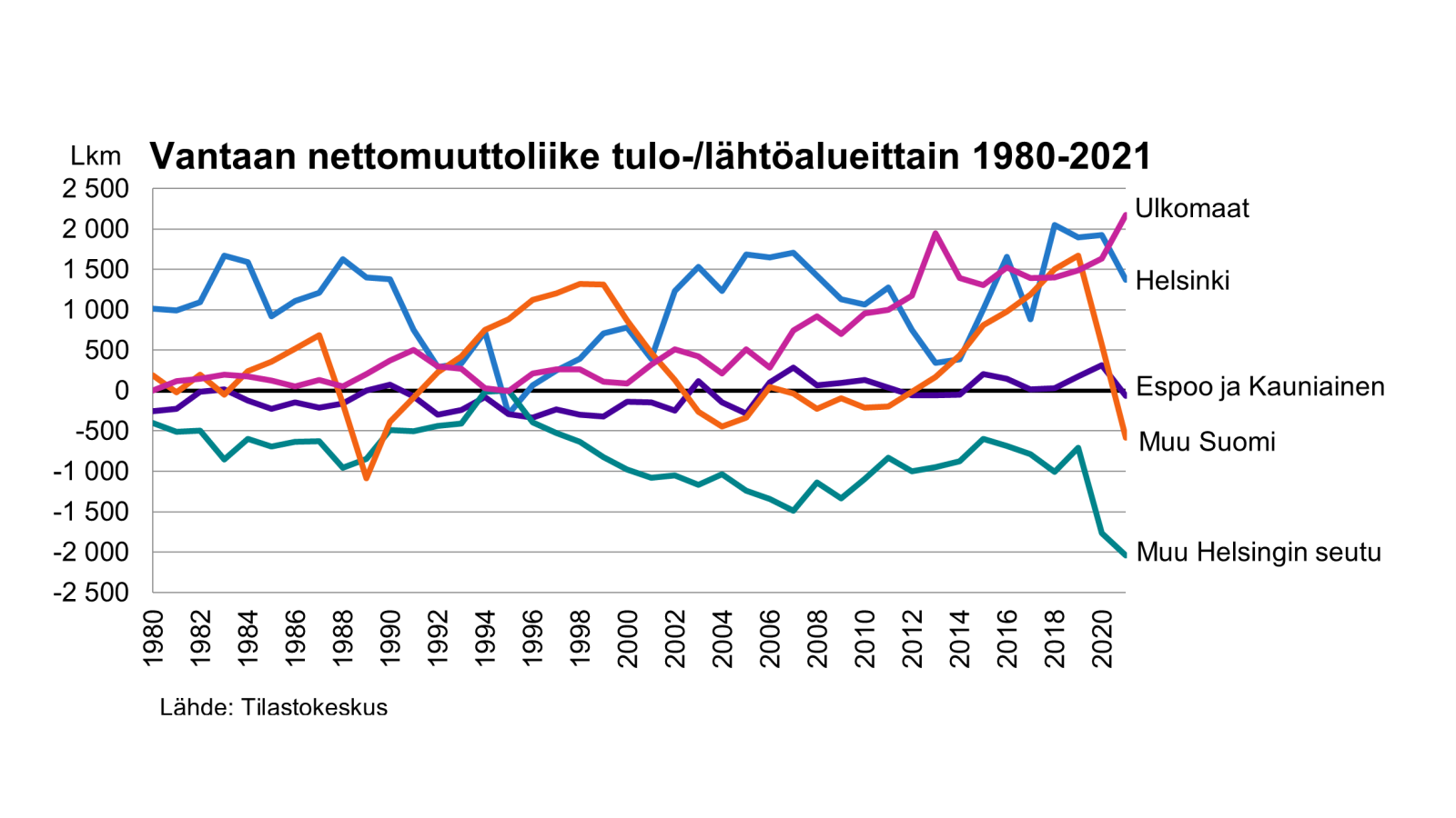 Vantaan muuttoliike pysyi kuitenkin positiivisena Helsingistä ja ulkomailta muuttavien ansiosta, vaikka nettomuutto Helsingistäkin väheni. Vuosina 2018–2020 Helsingistä saatu muuttovoitto oli poikkeuksellisen korkealla tasolla, noin 2 000 asukasta vuosittain, mutta vuonna 2021 muuttovoitto tippui 1 400 henkeen.