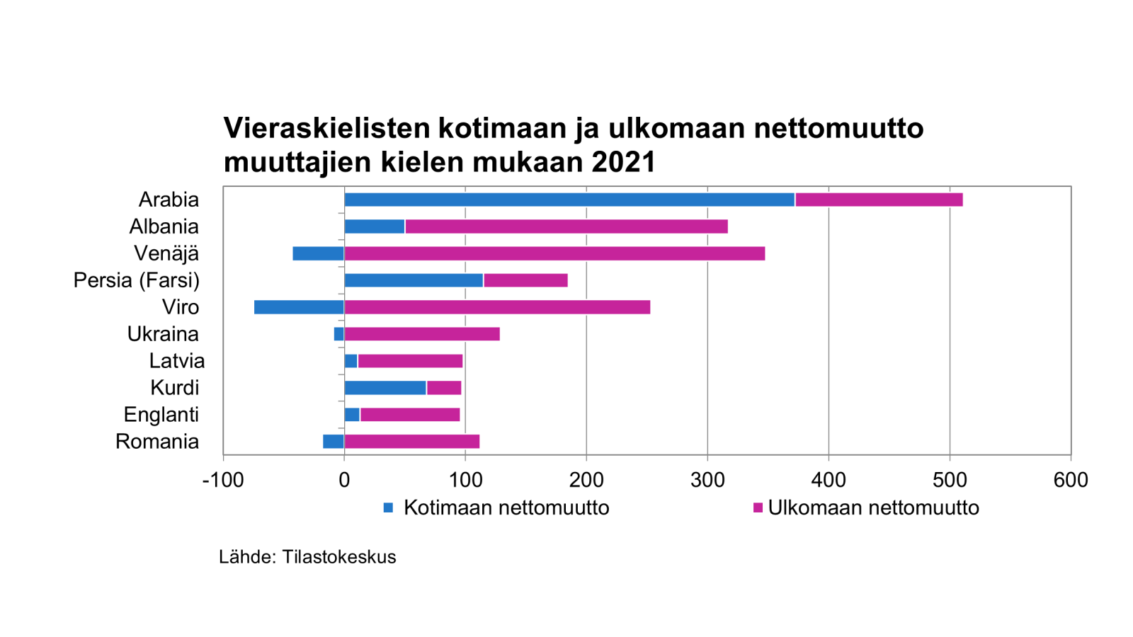Vuonna 2021 Vantaa sai eniten muuttovoittoa arabiankielisistä (+511) sekä albanian- ja venäjänkielisistä (+310). Vuosina 2017–2020 Vantaa sai kaikista yleisimmistä kieliryhmistä muuttovoittoa sekä kotimaasta että ulkomailta. Vuosi 2021 toi tähän poikkeuksen, sillä Vantaa kärsi Suomen sisäistä muuttotappiota viron-, romanian-, venäjän- ja ukrainankielisten kanssa. Näiden kieliryhmien muuttovoitosta kaikki tuli siis ulkomailta. Toisenlainen tilanne oli esimerkiksi arabian- ja kurdinkielisillä, joiden muuttovoitosta noin 70 prosenttia tuli muualta Suomesta.