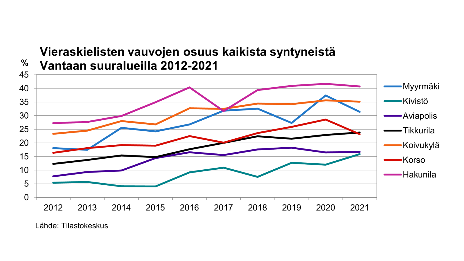 Viimeisten kymmenen vuoden aikana vieraskielisten vauvojen osuus on ollut lähes joka vuosi suurin Hakunilan ja alhaisin Kivistön suuralueella. Erot ovat suuret, sillä vuonna 2021 Hakunilan alueelle syntyneistä vauvoista yli 40 prosenttia oli vieraskielisiä, kun Kivistössä osuus oli 16 prosenttia.