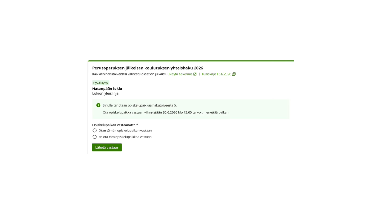 | Saadun opiskelupaikan vastaanottaminen viimeistään | torstaina 25.6.2026 |