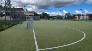 Koulun pihalla sijaitseva valaistu 42m x 30m kokoinen tekonurmikenttä, jossa yksi jalkapallokenttä ja kaksi sählykenttää maaleineen.