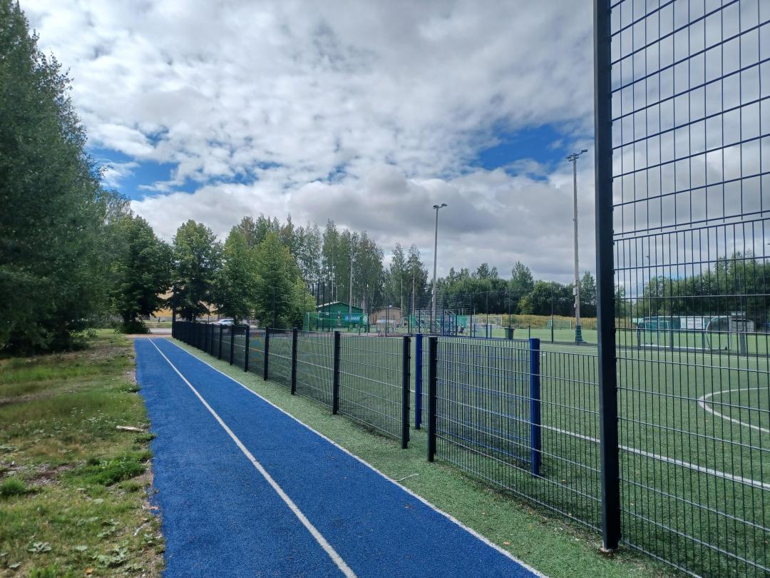 Jokivarren pieni tekonurmikenttä ja juoksusuora.