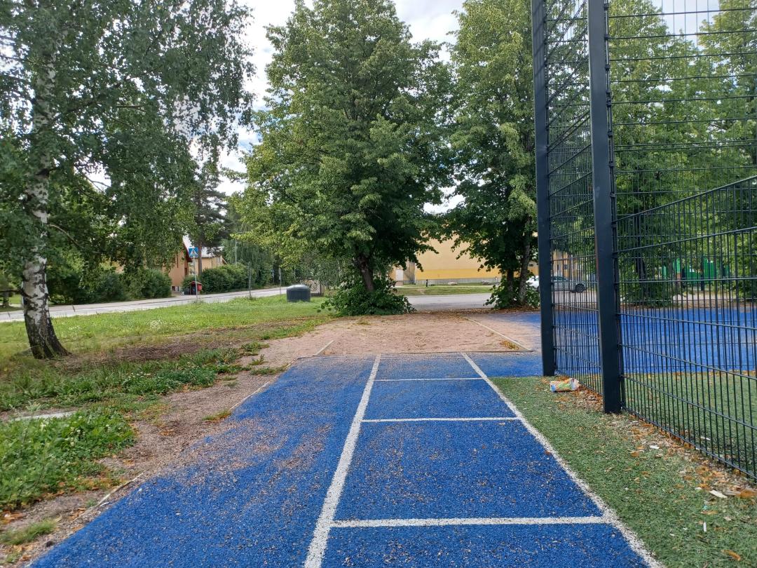 Jokivarren kentän juoksusuora pituushyppypaikan yhteydessä.