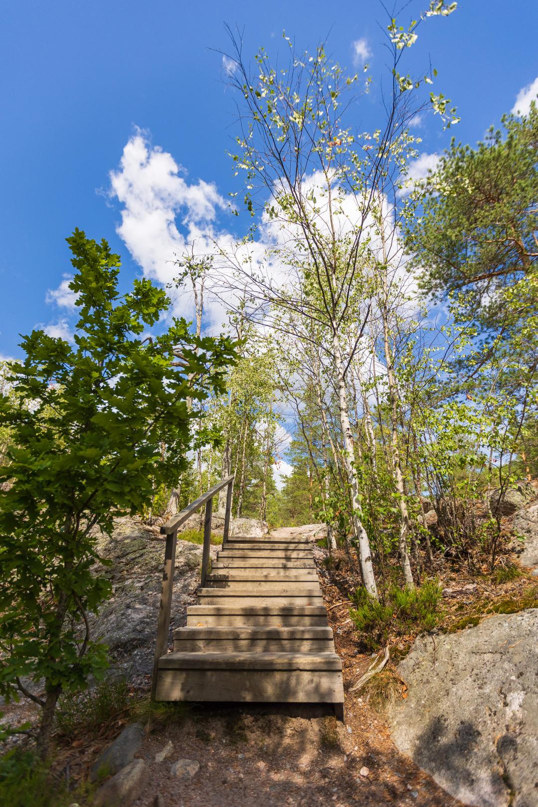 Kalkkikallion luontopolku on kapea. Reitin varrella on yhdet lyhyet portaat ja pitkospuut.
