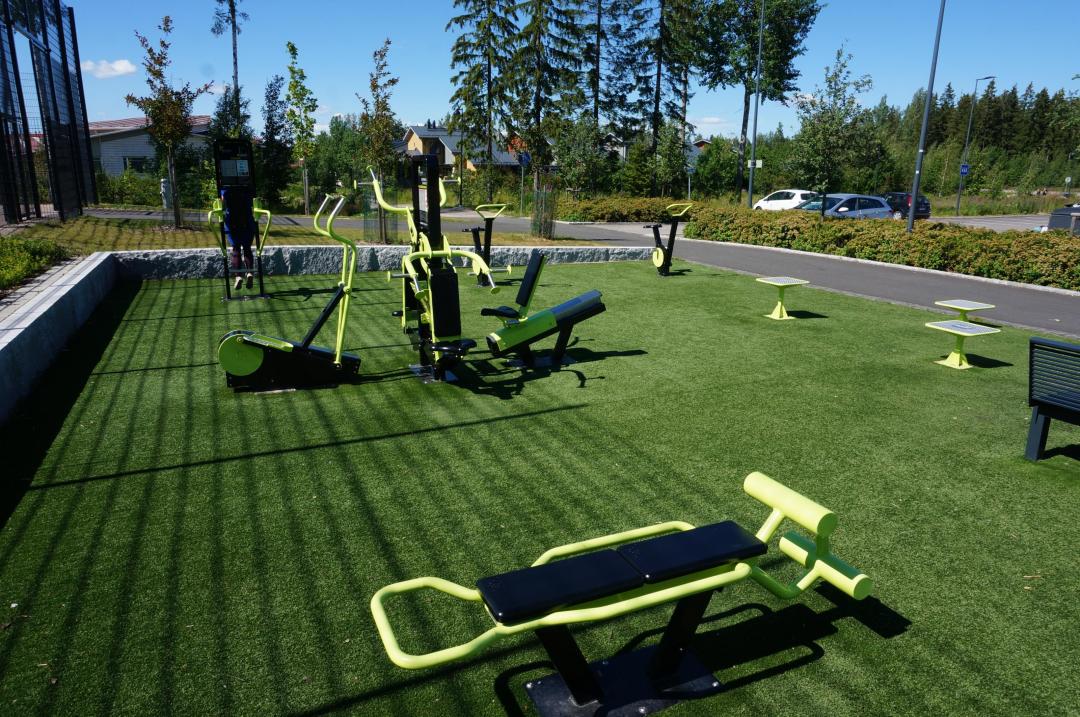 - Ulkokuntoiluvälineille on yksi sisääntuloreitti. Kuntoiluvälineet sijaitsevat tekonurmella, erottuen alustasta tummuuskontrastin avulla. Kuntoiluvälineiden ympärillä on yleisvalaistus.
