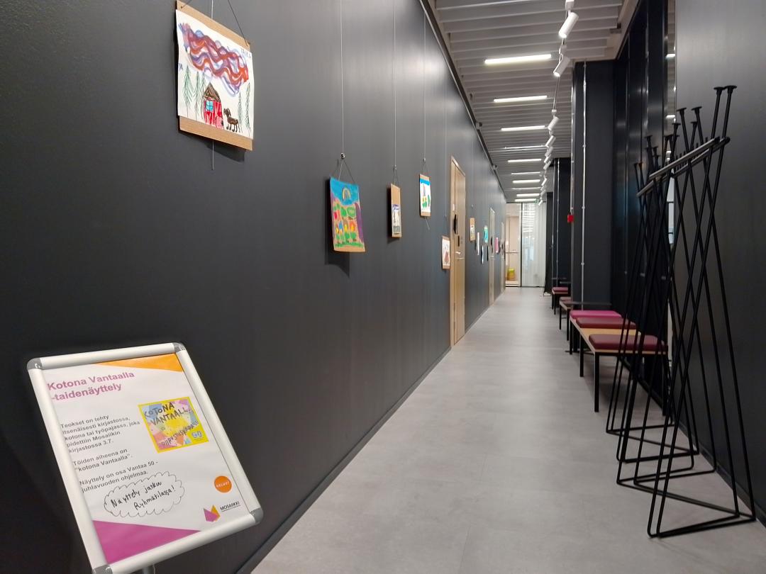 Lasten piirrustuksia Kotona Vantaalla -näyttelyssä Mosaiikin Galleriaseinällä.