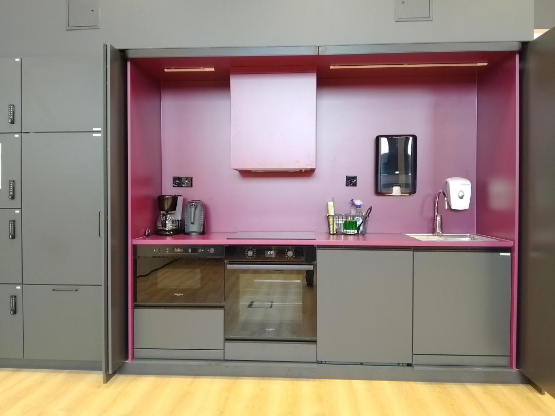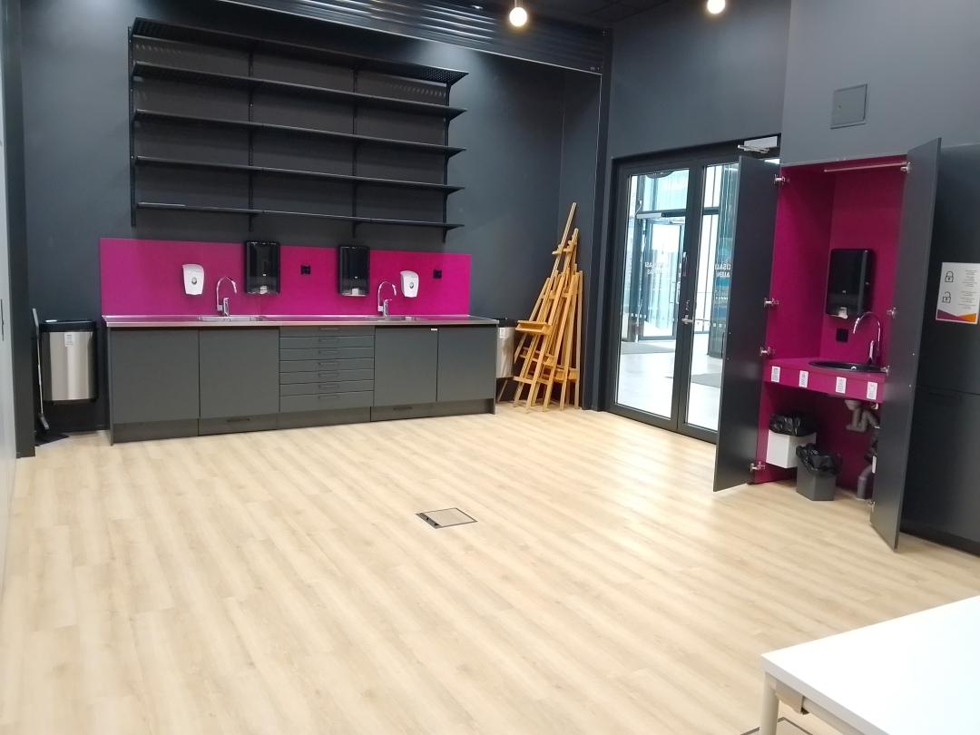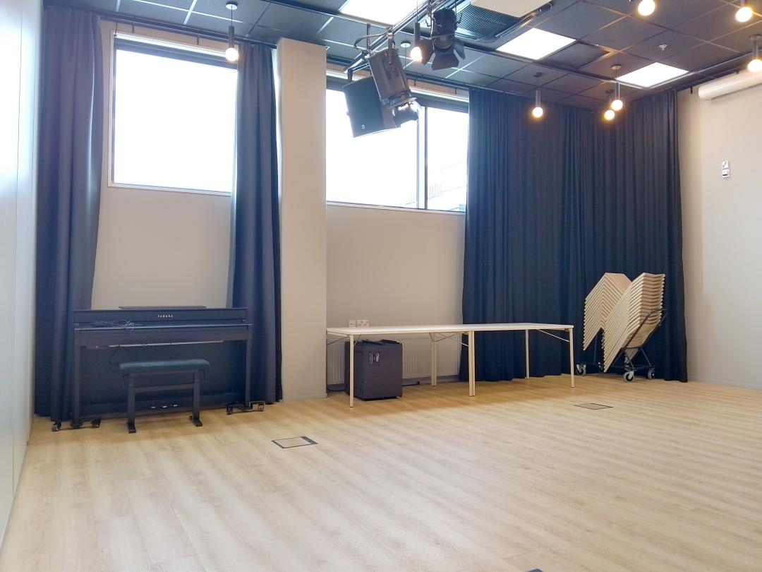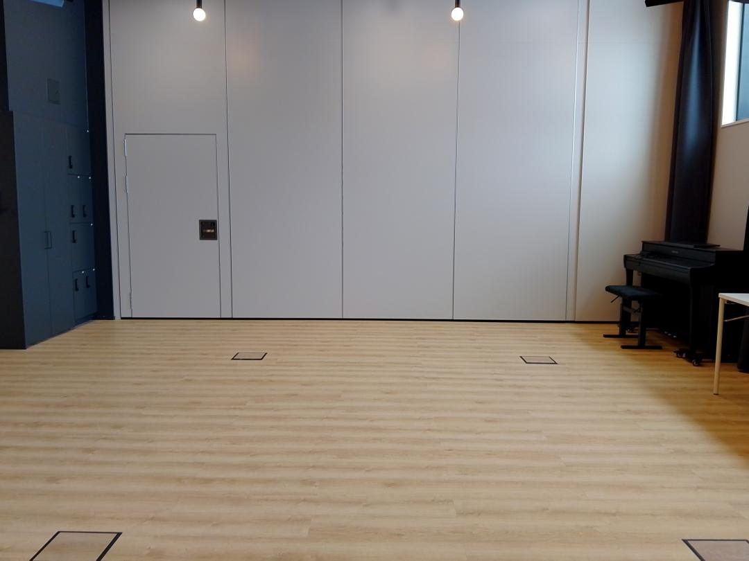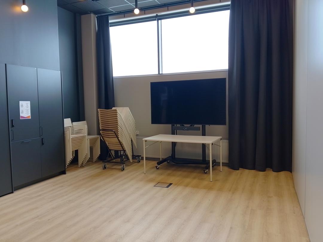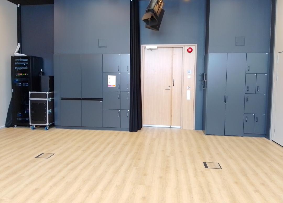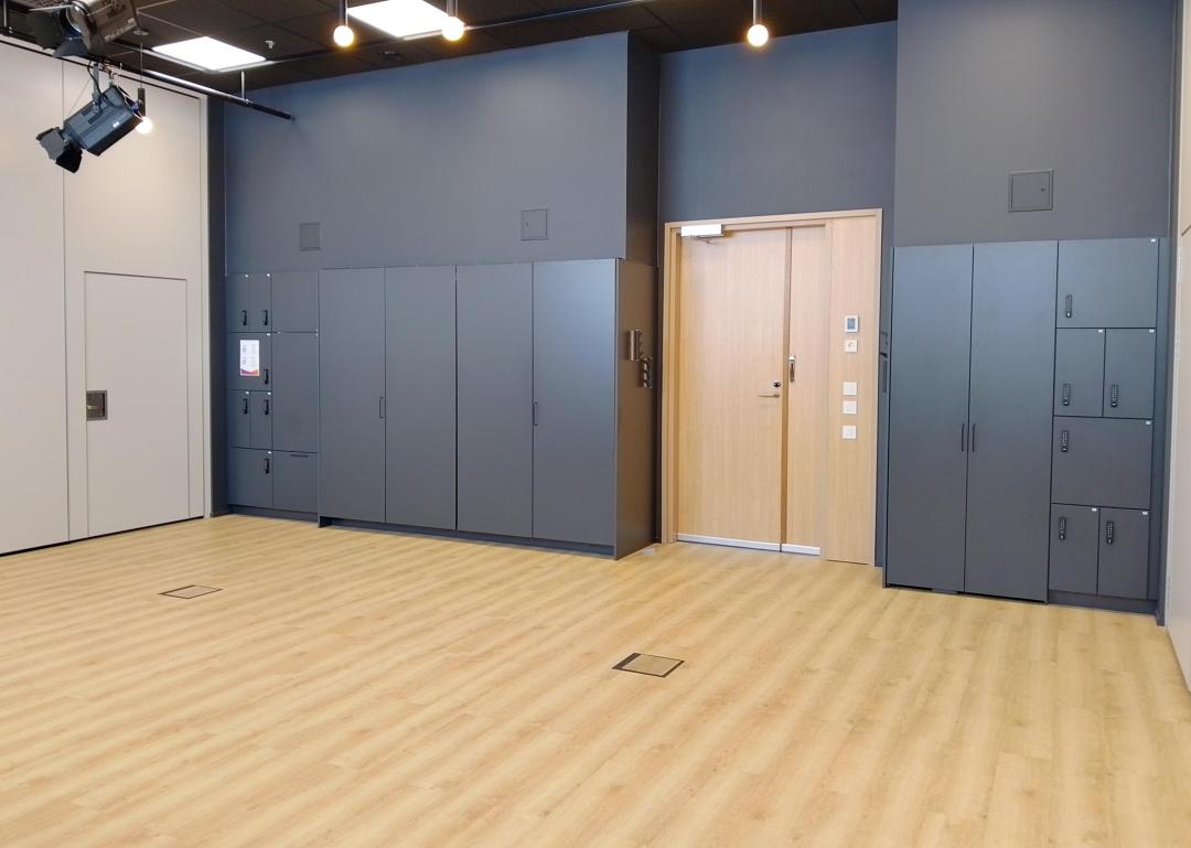 Monitoimitila 2:n oviseinä. Vasemmalla tekniikkanurkka. Jätä välineet kuvanmukaisesti käytön jälkeen.