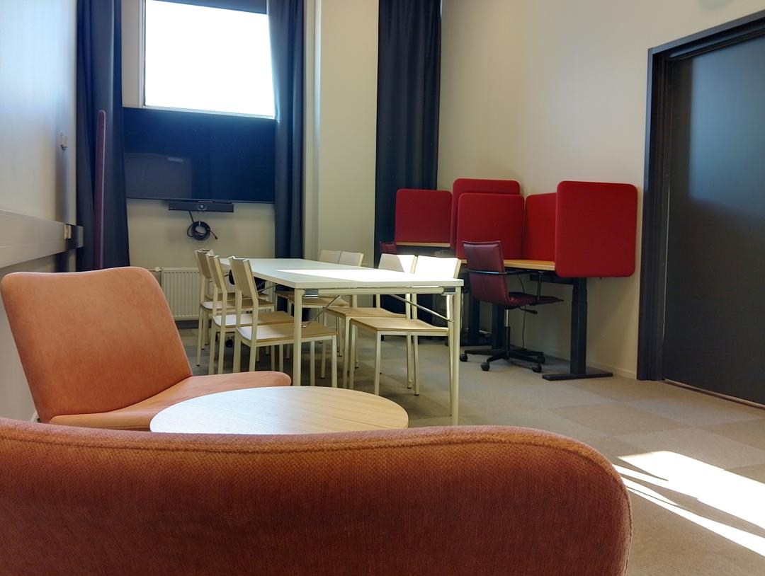 - Pöytäryhmä, 2 kpl erillistä työskentelypistettä ja istumaryhmä, jossa 2 kpl lepotuoleja.
