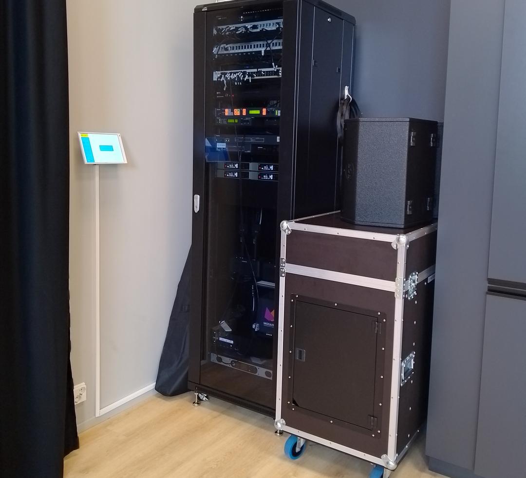 Safiirin ja Mosaiikkisalin tekniikkanurkka ja tekniikan ohjauspaneli. Laitteiden eteen saa vedettyä mustan verhon.