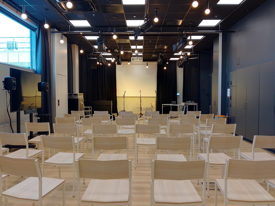 Safiirin päästyseinä toimii myös Mosaiikkisalin stagena. Seinälle avautuu valkokangas. Oikeassa nurkassa tekniikkaa ja tekniikan ohjauspaneli.