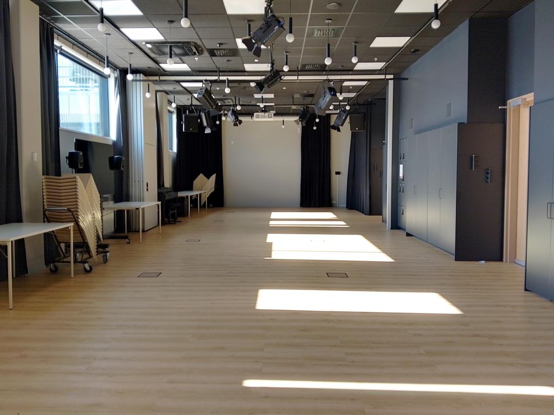 Mosaiikkisali kokonaisuutena. Mikäli tila jaetaan, etuosa on Monitoimitila 4; keskelle jää monitoimitila 3 ja takaosa on Monitoimitila 2.