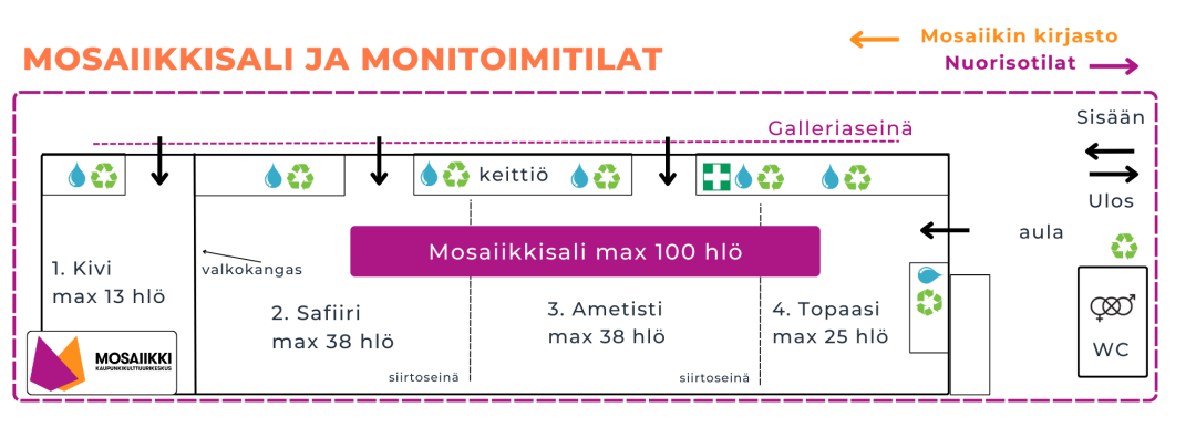 Mosaiikkisali muovautuu moneen käyttötarkoitukseen. Yhtenäisenä tilana saliin mahtuu jopa 100 henkeä. Sali voidaan jakaa kolmeen eri kokoiseen monitoimitilaan väliseinillä. Mikäli jokin salin osa on varattu, ei Mosaiikkisali ole käytettävissä.