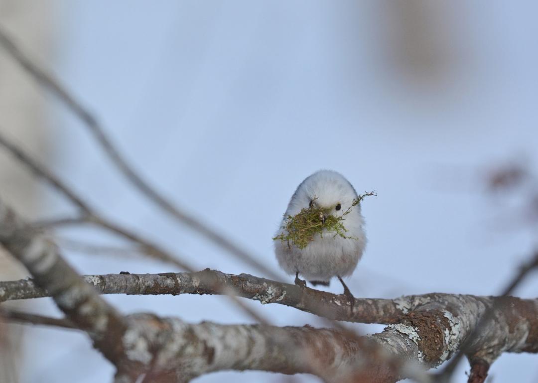 Pyrstötiainen on pienikokoinen lintu, jolla pitkämpyrstö, valkoinen pää ja mustat pienet nappisilmät.