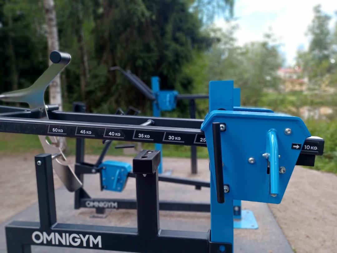 Ulkokuntoilupaikan laitteiden painon voi valita itselle sopivaksi siirtämällä kahvaa halutun painon kohdalle.