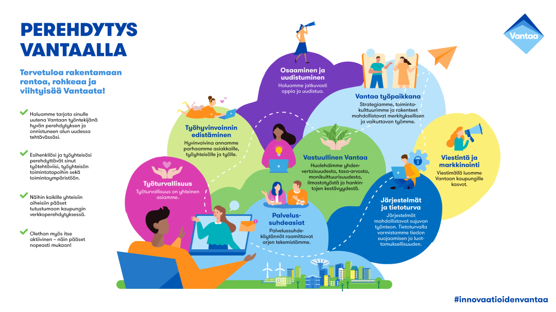 Perehdytysmallin ja -ohjeistusten rinnalla uudistettiin kaupungin yhteistä, kaikille uusille työntekijöille tarkoitettua verkkoperehdytyskokonaisuutta. Kokonaisuutta laajennettiin myös uusilla sisällöillä.