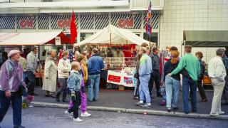 Liv och rörelse under Dickursby lantmarknad framför Citymarket Ollimari hösten 1990. Bild: Eero Happonen, Vanda stadsmuseum.