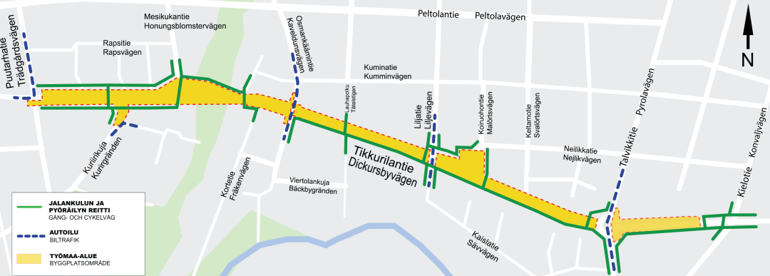 För gång- och cykeltrafik finns gång- och cykelvägar kvar. Övergångsställen för lätt trafik finns kvar med jämna mellanrum längs Dickursbyvägen. Kartor på gatunivå visar vägen till tillfälliga övergångsställen. Busstrafiken på Dickursbyvägen fortsätter längs omvägen via Peltolavägen. Kontrollera linjespecifika rutter på HRT:s webbplats