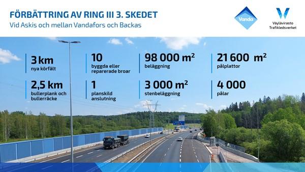 Förbättringsarbetet på Ring III som inleddes våren 2021 i Askis samt mellan Vandaforsen och Backas har slutförts före den uppskattade tidtabellen och under den uppskattade budgeten. Inom projektet byggdes ett tredje körfält på Ring III, som blir allt livligare, mellan Vandaforsen och Backas. Dessutom renoverade man vägens grundkonstruktion och byggde flera broar och en ny planskild anslutning i Askis. Projektets färdigställande firades i dag den 30.8 i Vanda.