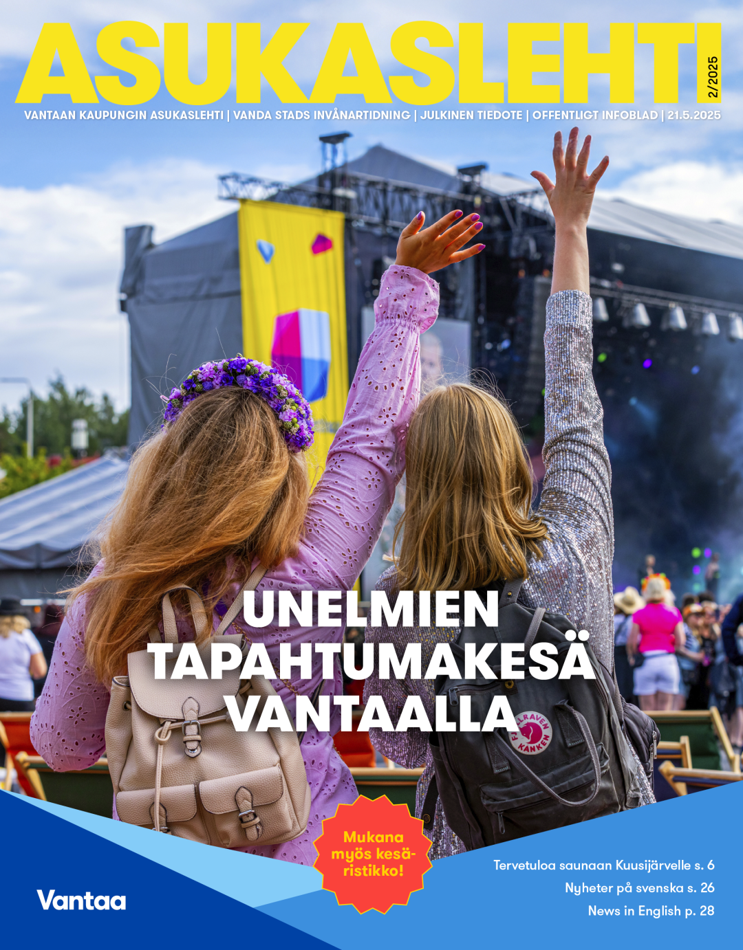 Nummer 2/2025 av invånartidningen utkommer på webben i 20.5. Du kan också hämta ett pappersexemplar på Vanda Info, i invånarlokalerna, på biblioteken, i simhallarna och på många andra av stadens verksamhetsställen. Du kan också läsa tidningen i ett tillgängligt format på webbplats eller ladda ner den till din enhet i pdf-format.