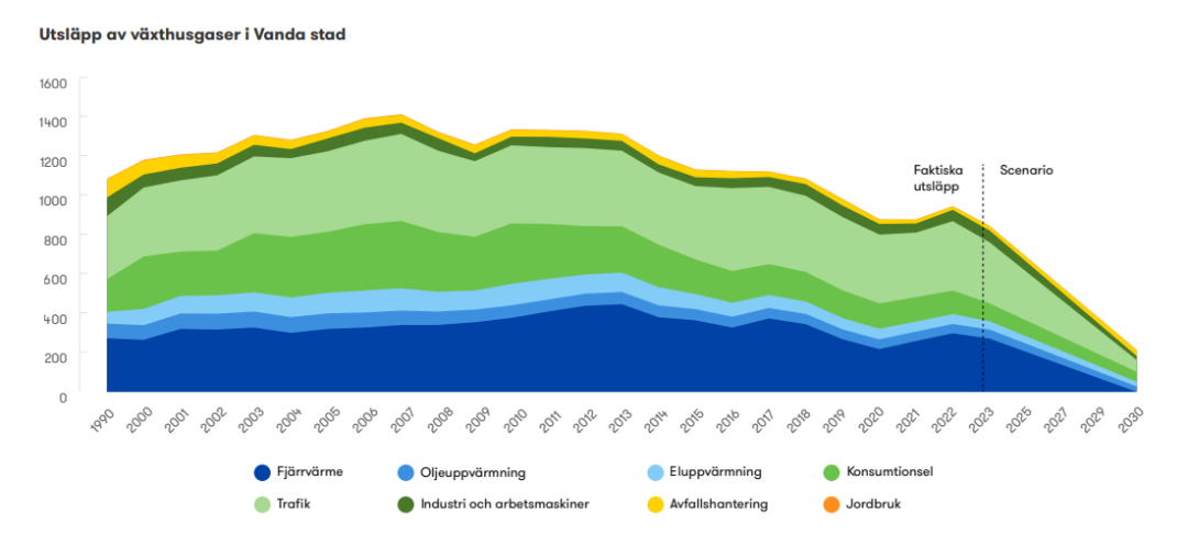 Vandas mål är att vara en koldioxidneutral stad före 2030. Vandas regionala utsläpp av växthusgaser har haft en nedåtgående trend sedan 2010. Undantagen är 2021 och 2022, då utsläppen ökade främst på grund av utsläpp från fjärrvärmeproduktionen.
