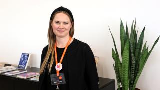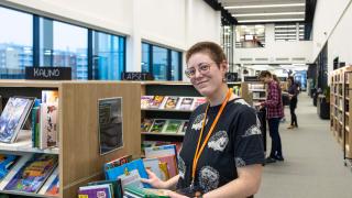 Antonia Ingvall betjänar kunder på svenska i det nya Mosaikbiblioteket