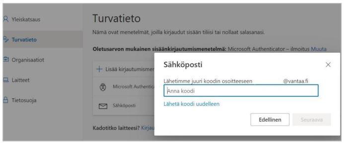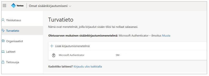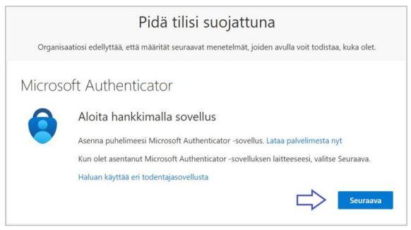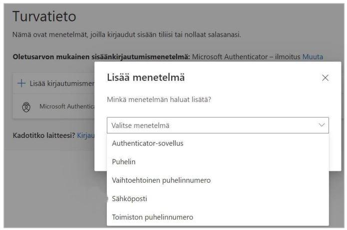 6. Starta användningen av Microsoft Authenticator-applikationen genom att välja "Authenticator-applikation" (Authenticator-sovellus) som metod. Om du föredrar att använda e-post eller telefonnummer går du till avsnitt 7.