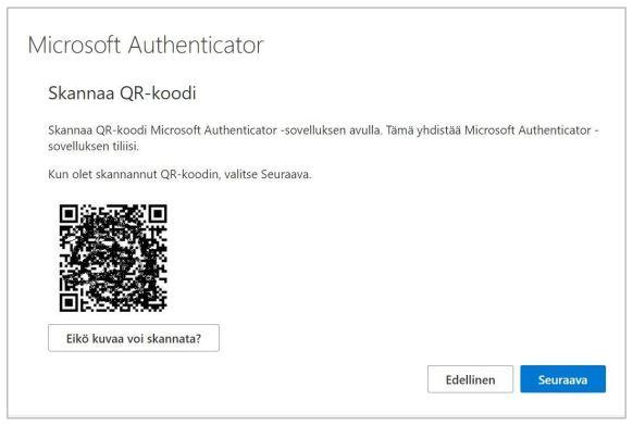 - I Authenticator-applikationen på din smarta enhet välj "Lägg till ett nytt konto” (Lisää uusi tili) → Arbets- eller skolkonto (Työ- tai koulutili) → Skanna QR-koden (Skannaa QR-koodi).