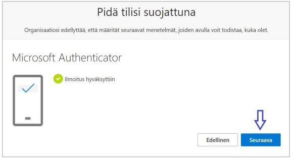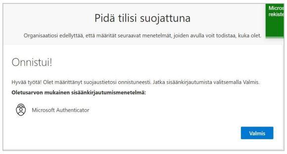 - Välj ”Nästa" (Seuraava) och sedan ”Klar" (Valmis). Microsoft Authenticator-applikationen är nu registrerad för SSPR-tjänsten.