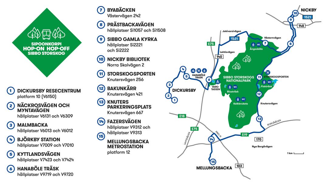 Hop-On Hop-Off -rutten går från Dickursby via Björkby station och Hanaböle träsk till Nickby i Sibbo. Från Nickby åker bussen via Sibbo gamla kyrka, den traditionella bastun vid Sibbo å och Storskogsporten till Mellungsbacka centrums metrostation. Bussens slutstationer är Dickursby, Nickby och Mellungsbacka. Det finns totalt 15 hållplatser på linjen.
