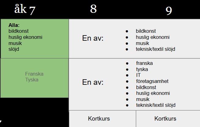 Eleverna väljer två tillvalsämnen, varav minst ett ska vara ett konst- och färdighetsämne. Det andra kan vara franska, tyska (om påbörjat i åk 7), informationsteknik eller företagsamhet.