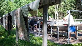 Vid mattvättstället i Ådalsparken finns tvättställ, mattmangel och torkningsställningar.